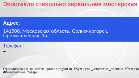 Экостекло, стекольно-зеркальная мастерская по адресу 141508, Московская область, Солнечногорск, Промышленная, 1а в дальнейшем Организация, размещена в следующих категориях: