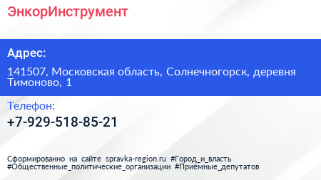 ЭнкорИнструмент по адресу 141507, Московская область, Солнечногорск, деревня Тимоново, 1 в дальнейшем Организация, размещена в следующих категориях: