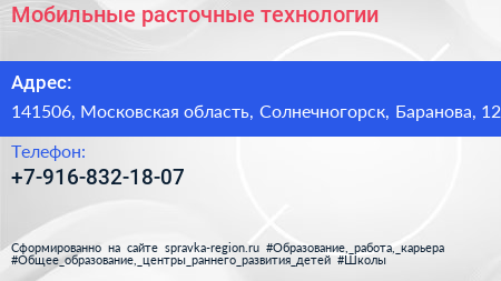 Для связи с организацией воспользуйтесь номером телефона: +7-916-832-18-07. Ежедневно с 09:00 до 20:00, вы можете обратиться в эту организацию.