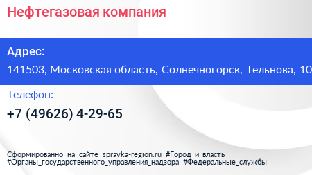 Нефтегазовая компания по адресу 141503, Московская область, Солнечногорск, Тельнова, 10 в дальнейшем Организация, размещена в следующих категориях: