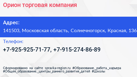 Орион, торговая компания по адресу 141503, Московская область, Солнечногорск, Красная, 136 в дальнейшем Организация, размещена в следующих категориях: