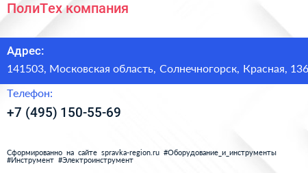 ПолиТех, компания по адресу 141503, Московская область, Солнечногорск, Красная, 136 в дальнейшем Организация, размещена в следующих категориях: