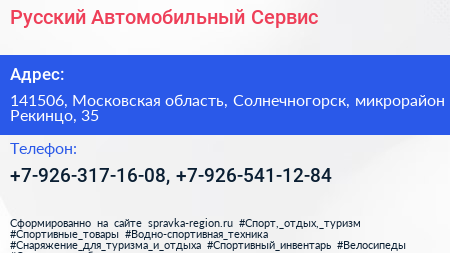 Русский Автомобильный Сервис по адресу 141506, Московская область, Солнечногорск, микрорайон Рекинцо, 35 в дальнейшем Организация, размещена в следующих категориях: