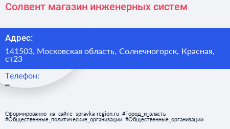 Солвент, магазин инженерных систем по адресу 141503, Московская область, Солнечногорск, Красная, ст23 в дальнейшем Организация, размещена в следующих категориях:
