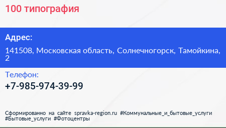 100%, типография по адресу 141508, Московская область, Солнечногорск, Тамойкина, 2 в дальнейшем Организация, размещена в следующих категориях: