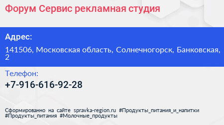 Форум Сервис, рекламная студия по адресу 141506, Московская область, Солнечногорск, Банковская, 2 в дальнейшем Организация, размещена в следующих категориях: