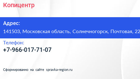 Копицентр по адресу 141503, Московская область, Солнечногорск, Почтовая, 22 в дальнейшем Организация, размещена в следующих категориях: