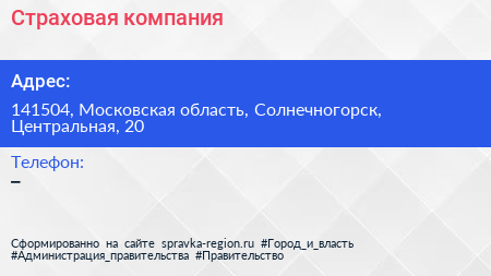 Страховая компания по адресу 141504, Московская область, Солнечногорск, Центральная, 20 в дальнейшем Организация, размещена в следующих категориях: