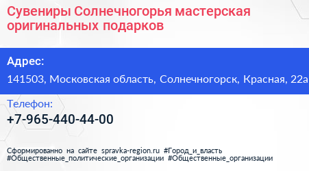 Сувениры Солнечногорья, мастерская оригинальных подарков по адресу 141503, Московская область, Солнечногорск, Красная, 22а в дальнейшем Организация, размещена в следующих категориях: