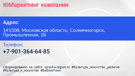 ЮМаркетинг, компания по адресу 141508, Московская область, Солнечногорск, Промышленная, 1Б в дальнейшем Организация, размещена в следующих категориях: