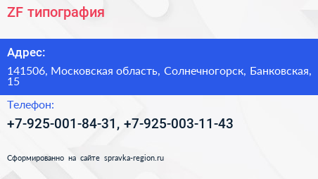 ZF, типография по адресу 141506, Московская область, Солнечногорск, Банковская, 15 в дальнейшем Организация, размещена в следующих категориях: