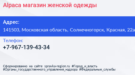Alpaca, магазин женской одежды по адресу 141503, Московская область, Солнечногорск, Красная, 22а в дальнейшем Организация, размещена в следующих категориях:
