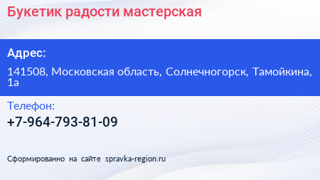 Букетик радости, мастерская по адресу 141508, Московская область, Солнечногорск, Тамойкина, 1а в дальнейшем Организация, размещена в следующих категориях: