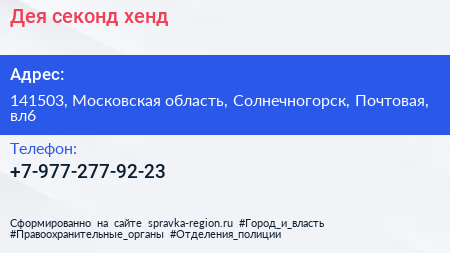 Дея, секонд-хенд по адресу 141503, Московская область, Солнечногорск, Почтовая, вл6 в дальнейшем Организация, размещена в следующих категориях: