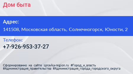 Дом быта по адресу 141508, Московская область, Солнечногорск, Юности, 2 в дальнейшем Организация, размещена в следующих категориях: