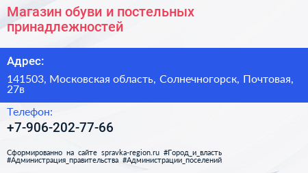 Магазин обуви и постельных принадлежностей по адресу 141503, Московская область, Солнечногорск, Почтовая, 27в в дальнейшем Организация, размещена в следующих категориях: