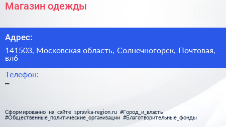 Магазин одежды по адресу 141503, Московская область, Солнечногорск, Почтовая, вл6 в дальнейшем Организация, размещена в следующих категориях: