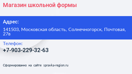 Магазин школьной формы по адресу 141503, Московская область, Солнечногорск, Почтовая, 27в в дальнейшем Организация, размещена в следующих категориях: