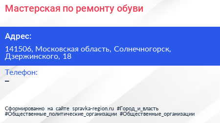 Мастерская по ремонту обуви по адресу 141506, Московская область, Солнечногорск, Дзержинского, 18 в дальнейшем Организация, размещена в следующих категориях: