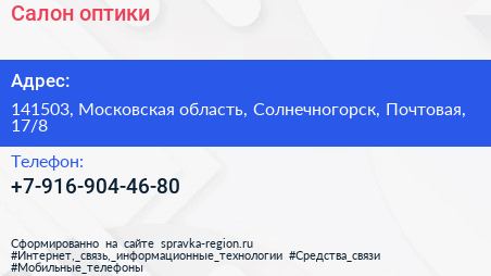 Салон оптики по адресу 141503, Московская область, Солнечногорск, Почтовая, 17/8 в дальнейшем Организация, размещена в следующих категориях: