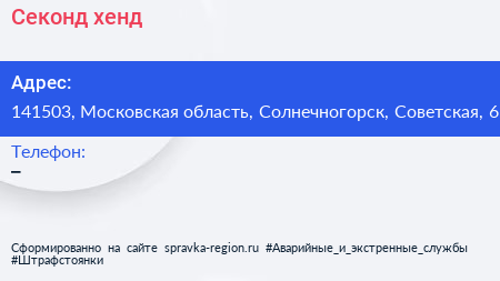 Секонд-хенд по адресу 141503, Московская область, Солнечногорск, Советская, 6 в дальнейшем Организация, размещена в следующих категориях: