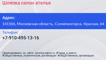 Шляпка, салон-ателье по адресу 141506, Московская область, Солнечногорск, Красная, 64 в дальнейшем Организация, размещена в следующих категориях: