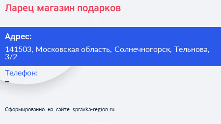Ларец, магазин подарков по адресу 141503, Московская область, Солнечногорск, Тельнова, 3/2 в дальнейшем Организация, размещена в следующих категориях: