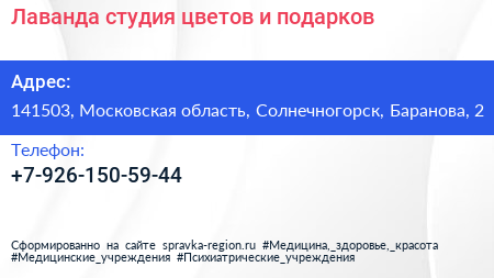 Лаванда, студия цветов и подарков по адресу 141503, Московская область, Солнечногорск, Баранова, 2 в дальнейшем Организация, размещена в следующих категориях: