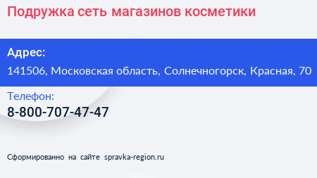 Подружка, сеть магазинов косметики по адресу 141506, Московская область, Солнечногорск, Красная, 70 в дальнейшем Организация, размещена в следующих категориях: