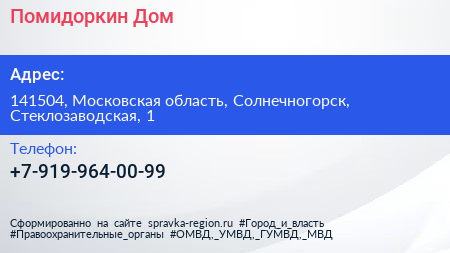 Помидоркин Дом по адресу 141504, Московская область, Солнечногорск, Стеклозаводская, 1 в дальнейшем Организация, размещена в следующих категориях: