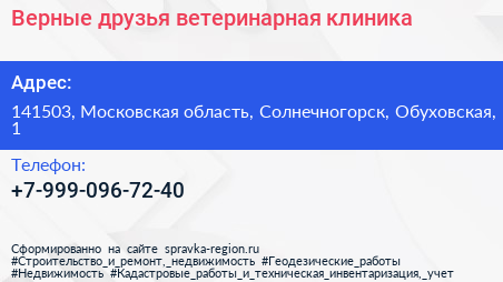 Верные друзья, ветеринарная клиника по адресу 141503, Московская область, Солнечногорск, Обуховская, 1 в дальнейшем Организация, размещена в следующих категориях:
