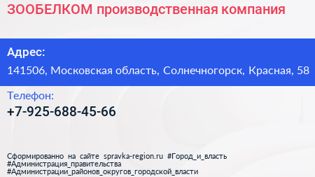 ЗООБЕЛКОМ, производственная компания по адресу 141506, Московская область, Солнечногорск, Красная, 58 в дальнейшем Организация, размещена в следующих категориях: