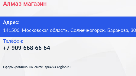 Алмаз, магазин по адресу 141506, Московская область, Солнечногорск, Баранова, 30 в дальнейшем Организация, размещена в следующих категориях: