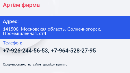Артём, фирма по адресу 141508, Московская область, Солнечногорск, Промышленная, ст4 в дальнейшем Организация, размещена в следующих категориях:
