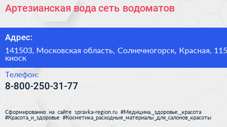 Артезианская вода, сеть водоматов по адресу 141503, Московская область, Солнечногорск, Красная, 115 киоск в дальнейшем Организация, размещена в следующих категориях: