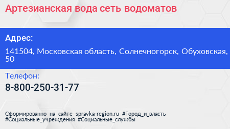 Артезианская вода, сеть водоматов по адресу 141504, Московская область, Солнечногорск, Обуховская, 50 в дальнейшем Организация, размещена в следующих категориях: