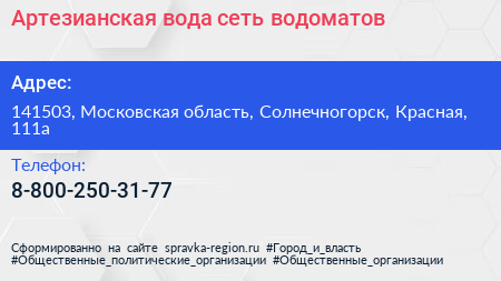 Артезианская вода, сеть водоматов по адресу 141503, Московская область, Солнечногорск, Красная, 111а в дальнейшем Организация, размещена в следующих категориях: