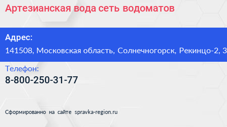 Артезианская вода, сеть водоматов по адресу 141508, Московская область, Солнечногорск, Рекинцо-2, 3 в дальнейшем Организация, размещена в следующих категориях: