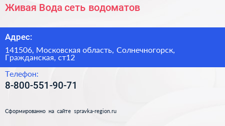 Живая Вода, сеть водоматов по адресу 141506, Московская область, Солнечногорск, Гражданская, ст12 в дальнейшем Организация, размещена в следующих категориях: