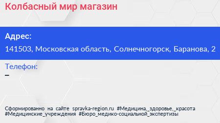 Колбасный мир, магазин по адресу 141503, Московская область, Солнечногорск, Баранова, 2 в дальнейшем Организация, размещена в следующих категориях: