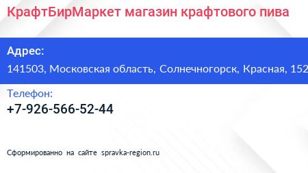 КрафтБирМаркет, магазин крафтового пива по адресу 141503, Московская область, Солнечногорск, Красная, 152 в дальнейшем Организация, размещена в следующих категориях: