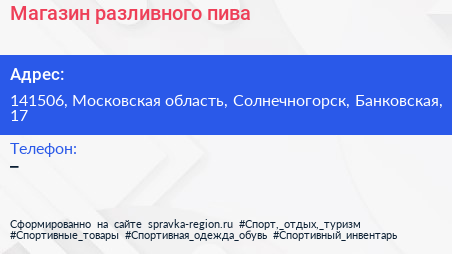Магазин разливного пива по адресу 141506, Московская область, Солнечногорск, Банковская, 17 в дальнейшем Организация, размещена в следующих категориях: