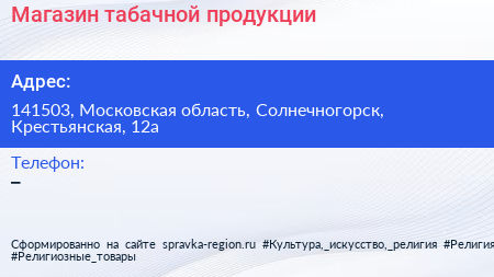 Магазин табачной продукции по адресу 141503, Московская область, Солнечногорск, Крестьянская, 12а в дальнейшем Организация, размещена в следующих категориях: