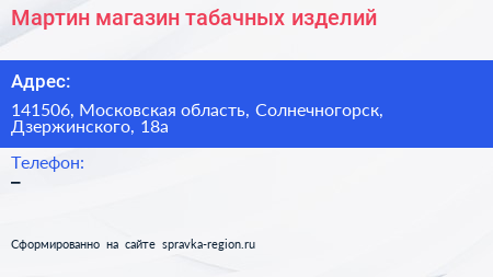 Мартин, магазин табачных изделий по адресу 141506, Московская область, Солнечногорск, Дзержинского, 18а в дальнейшем Организация, размещена в следующих категориях: