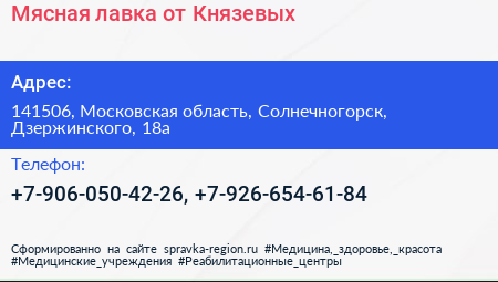 Мясная лавка от Князевых по адресу 141506, Московская область, Солнечногорск, Дзержинского, 18а в дальнейшем Организация, размещена в следующих категориях: