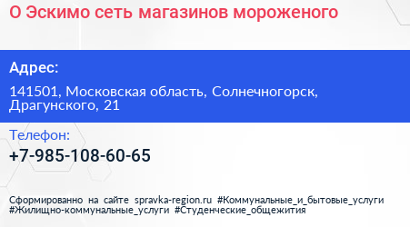 О! Эскимо, сеть магазинов мороженого по адресу 141501, Московская область, Солнечногорск, Драгунского, 21 в дальнейшем Организация, размещена в следующих категориях: