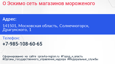 О! Эскимо, сеть магазинов мороженого по адресу 141501, Московская область, Солнечногорск, Драгунского, 1 в дальнейшем Организация, размещена в следующих категориях: