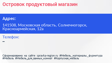 Островок, продуктовый магазин по адресу 141508, Московская область, Солнечногорск, Красноармейская, 12а в дальнейшем Организация, размещена в следующих категориях:
