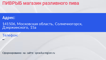 ПИВРЫБ, магазин разливного пива по адресу 141506, Московская область, Солнечногорск, Дзержинского, 15а в дальнейшем Организация, размещена в следующих категориях: