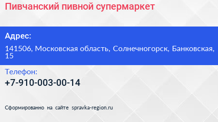 Пивчанский, пивной супермаркет по адресу 141506, Московская область, Солнечногорск, Банковская, 15 в дальнейшем Организация, размещена в следующих категориях:
